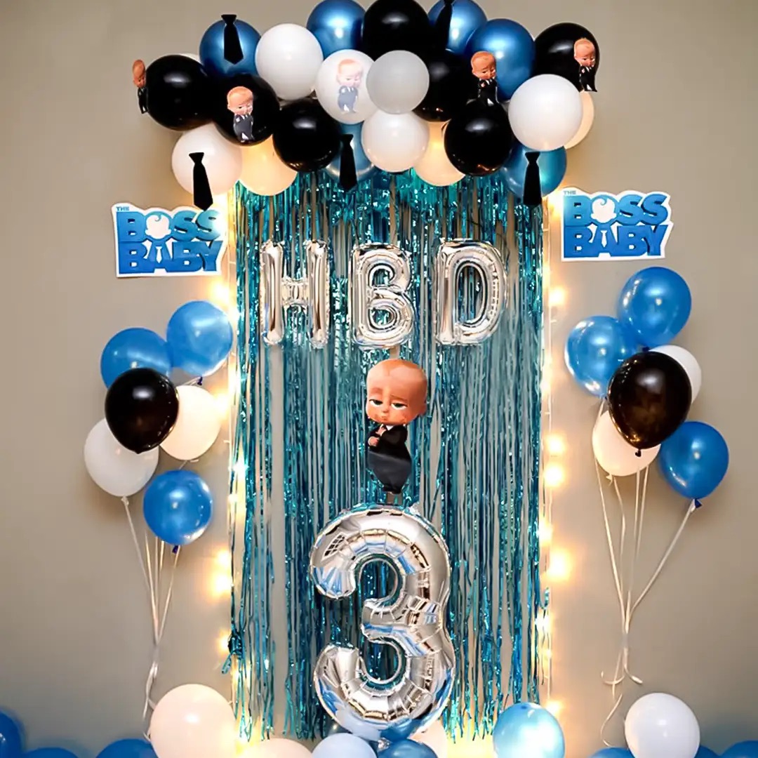 • The birthday decoration has blue frill curtains paired with “HBD” letter foil balloons. It also has a balloon arch in blue, white, and black that adds a touch of elegance. We have decorated Boss Baby-themed foil balloons and cutouts all around this decor. The decor also includes fairy lights and a numeric foil balloon that can be customized. The floor around is covered with loose balloons. Capture precious moments beside this decor on this special day.