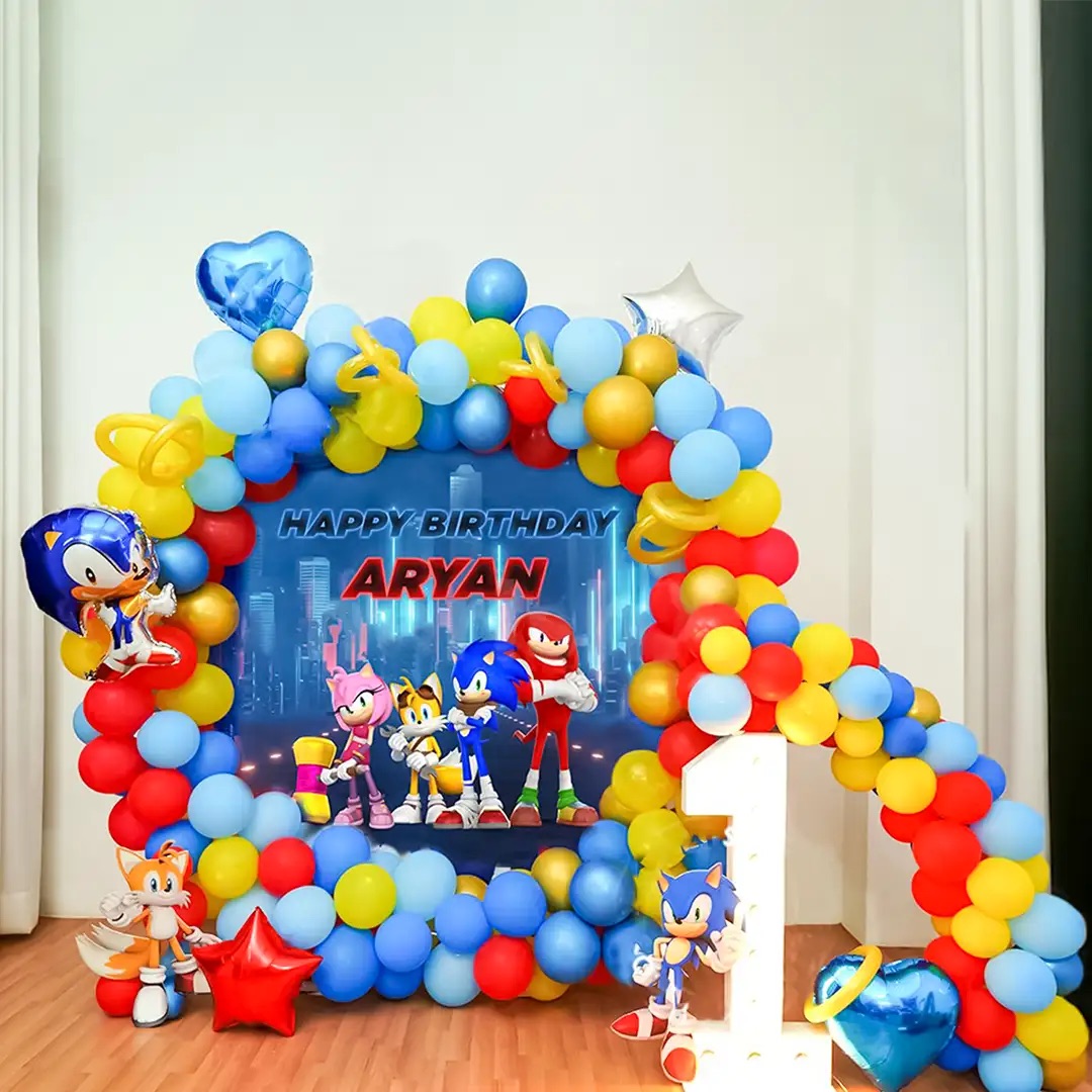 - Sonic Theme Balloon Arch of 250 Balloons of Color 60 Dark Blue Latex, 60 Light Blue Latex, 60 Yellow Latex, 50 Red Latex and 20 Golden Chrome Balloons Decorated with 9 Golden BT Balloons